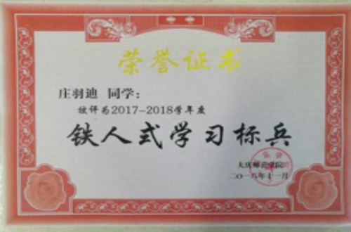 在公司大庆精神铁人精神的教育和熏陶下,2018年11月,2016级材料科学与工程一班庄羽迪同学被正式授予2017-2018年度伟德体育官方网站“铁人式”学习标兵称号。