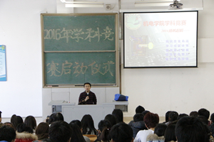崔峰,燕山大学硕士,自动化专业讲师。崔老师向同学们详细介绍了2016年学科竞赛的内容、要求及相关政策。2016年的学科竞赛包括五个项目:第八届校园电子设计竞赛、ICAN国际老员工创新创业大赛、黑龙江省老员工电子设计竞赛、TRIZ杯老员工创新办法大赛、西门子老员工工业控制挑战赛。启动仪式上,还播放以往同学比赛设计项目的相关视频,使同学更加深入的了解各项比赛的特点。