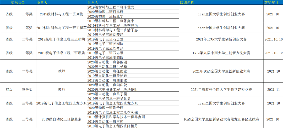 2021年以来,机电学子积极参加各类比赛并取得佳绩。2021年8月20日至11月28日,各项比赛累计获奖共12项,其中,省级比赛二等奖5项、三等奖3项;校级比赛三等奖3项;优秀奖1项。