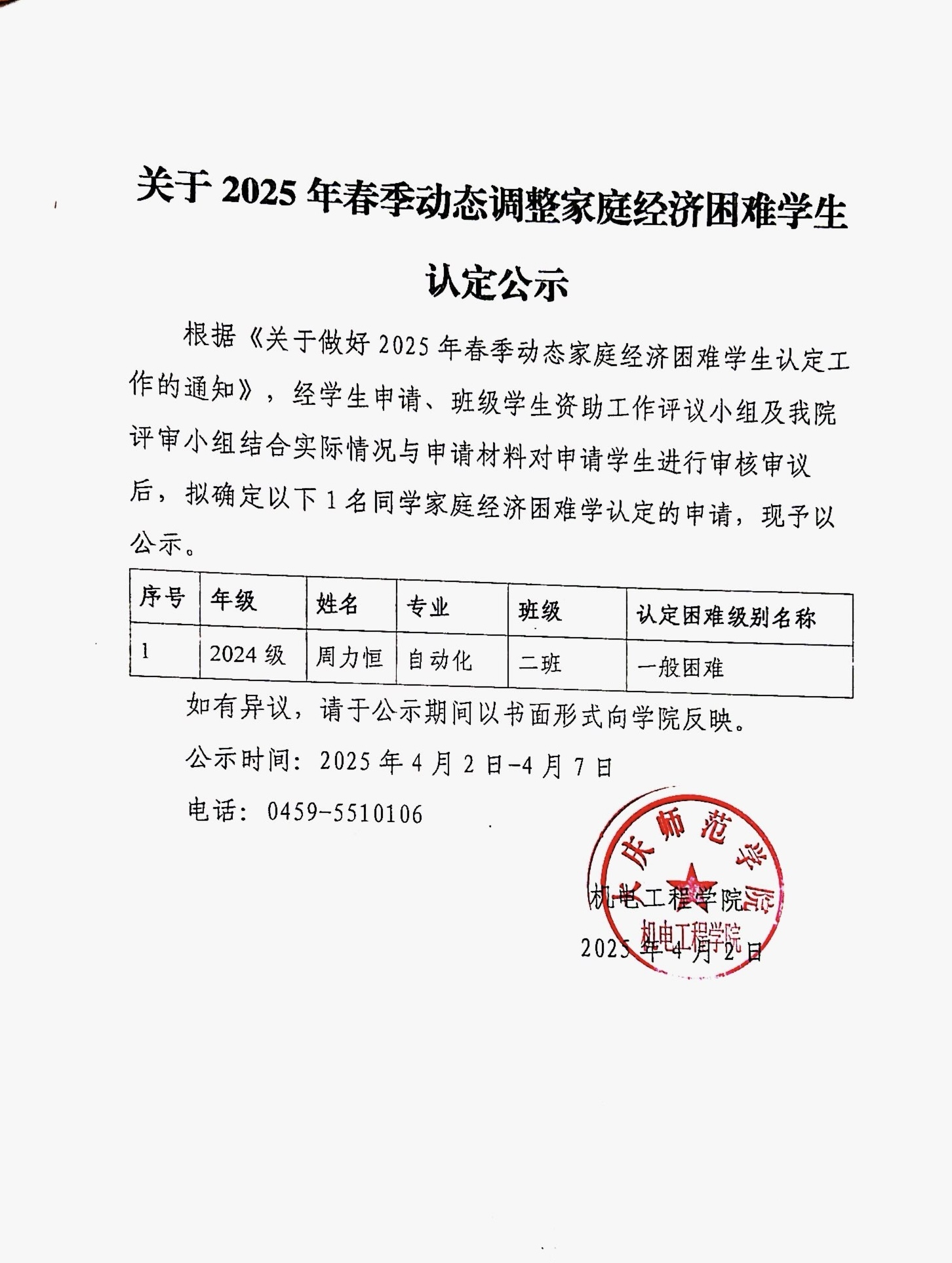 2024-2025春季学期动态调整家庭经济困难员工认定公示