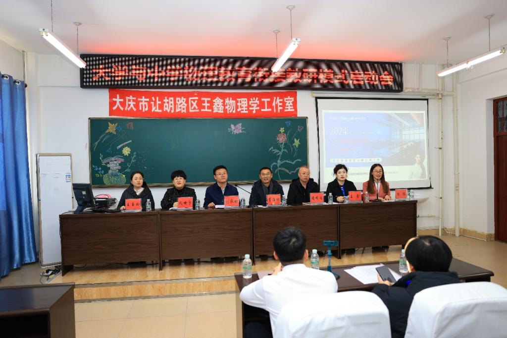 教研活动现场,气氛热烈,众多教育领域的精英齐聚一堂。让胡路区进修公司董事长崔海彬、副董事长潘明浩、初中物理工作室负责人王鑫,以及伟德体育官方网站经理刘永皓、党总支书记闻世宇、副经理王玉玲、物理学专业全体教师和来自大庆市让胡路区11所初级中学的物理骨干教师出席会议,会议由物理学专业负责人杨瑞主持。启动会上刘永皓介绍了物理学专业“一融合三突出”特色、团队力量及发展状况,崔海彬立足基础物理教育现状、对师范生的职业技能培养方向进行方法指导、与会双方表达长期合作的意愿。