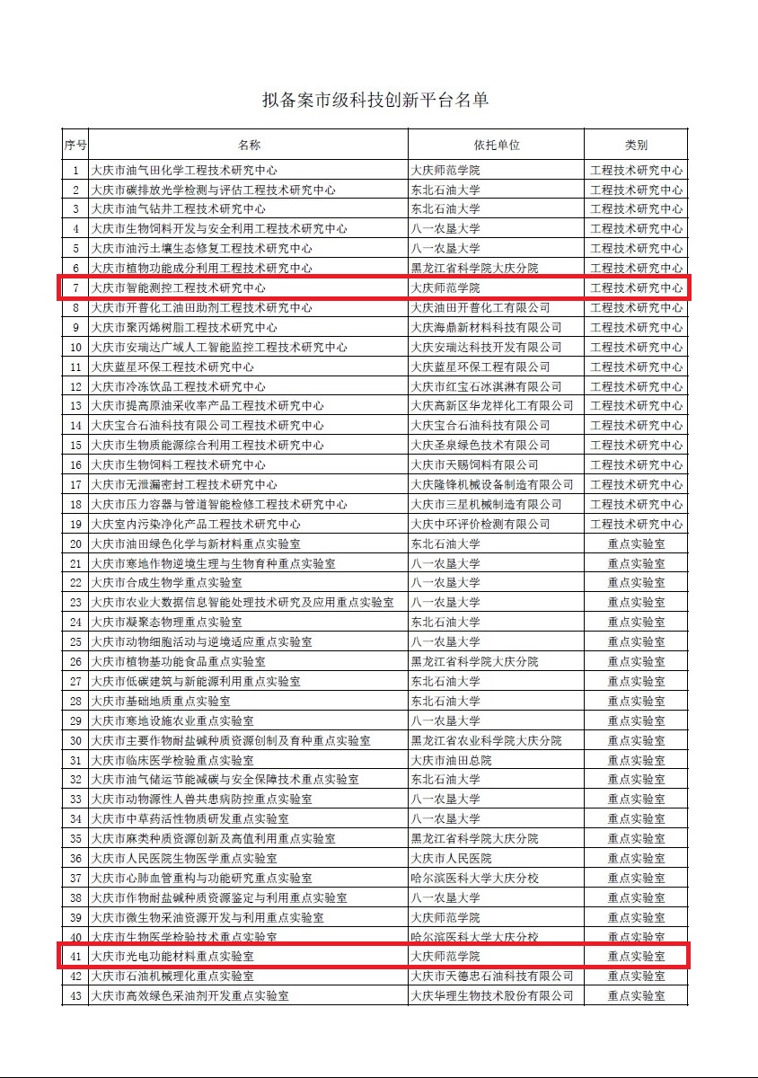 近日,大庆市科学技术局公布了市级科技创新平台名单,全市合计43家科技创新平台入选。公司申报的“大庆市智能测控工程技术研究中心”、“大庆市光电功能材料重点实验室”成功获批备案。